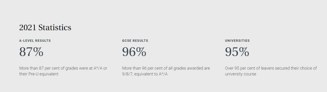 第三个特点,那一定就是“强”了!这个“强”指的就是学校的学术实力十分强劲!2021 年,超过 87% 学生的 A-level 成绩为A-A*,超过96% 的学生的 GSCE 成绩为 7-9或同等水平。