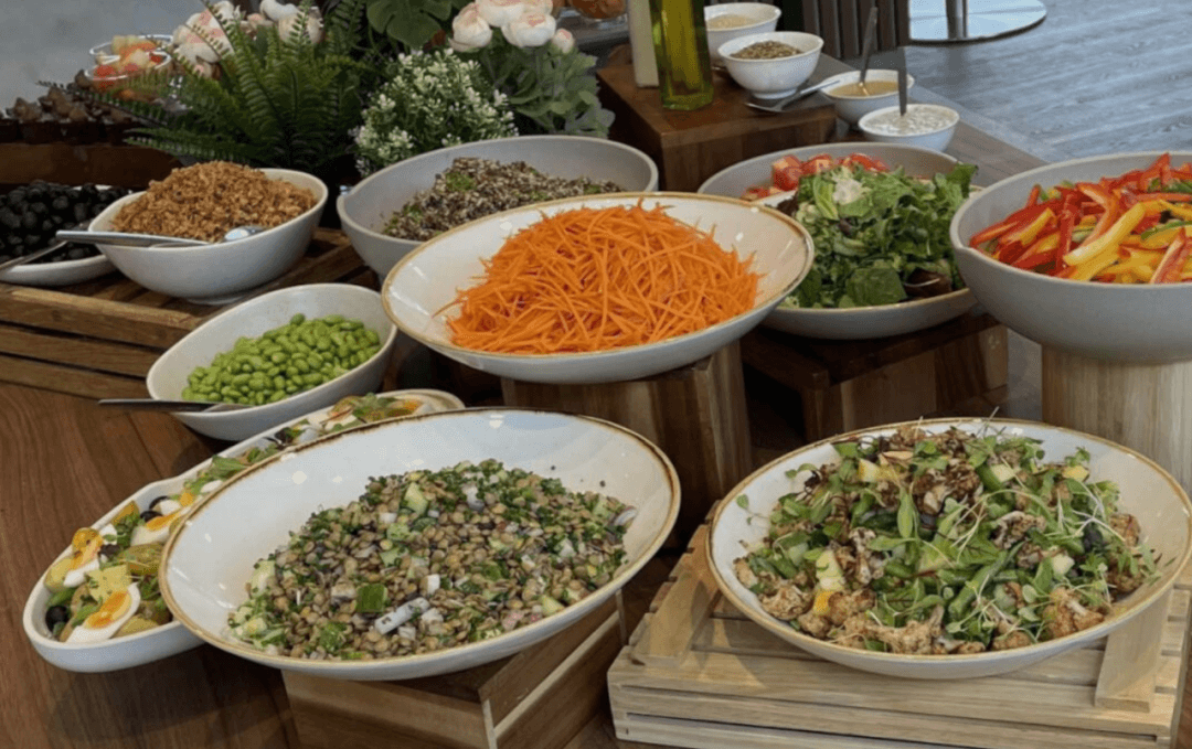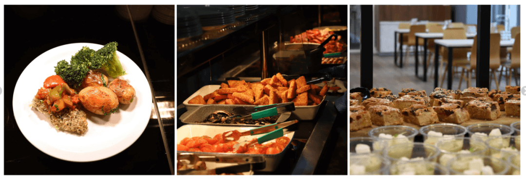 拥有庞大的餐饮团队,现场烹饪各种菜肴。午餐通常包括两道主食、汤、沙拉吧和甜点,还有丰富的素食和纯素选择。这里的午餐就像一场自助小派对,每个人都能找到自己喜欢的那一份。